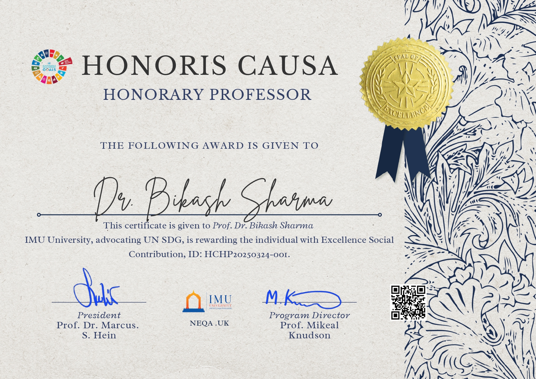 - Dr. Sharma received the Certificate of Special Recognition at the Global Summit of Communities and Ethnic Groups, Mexico in recognition of contribution to world peace through activities promoting humanitarian development as well as instilling hope and dreams to people in different situations and creating the value of life